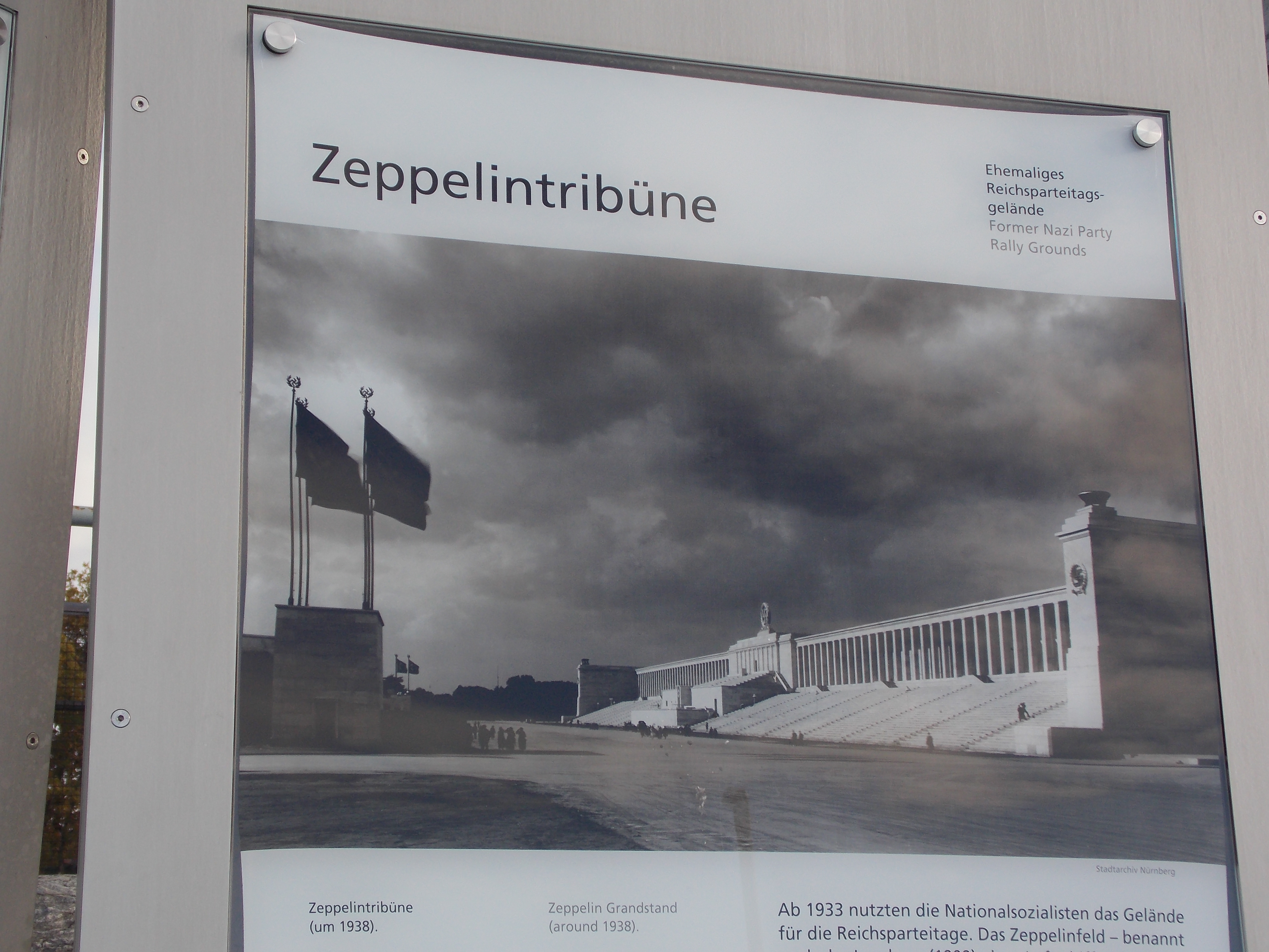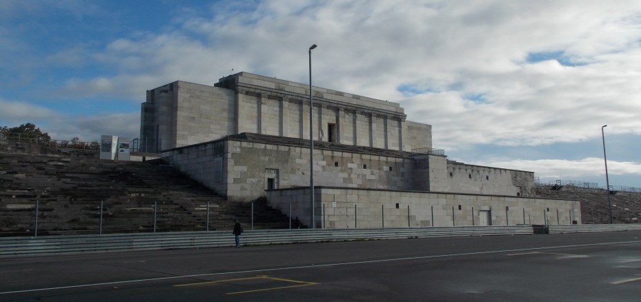 I climbed up the stairs to the presentation stand, paused a moment, and walked out onto the platform where Hitler used to speak. We’ve all seen pictures and video of those rallies, more than 300 huge swastika flags waving in the wind, the little man saluting 250,000 of his lemmings. All kinds of thoughts go through your mind standing there. How does one evil man get so many disenfranchised young men to follow him? How could this have happened, and are we really sure it can never happen again?