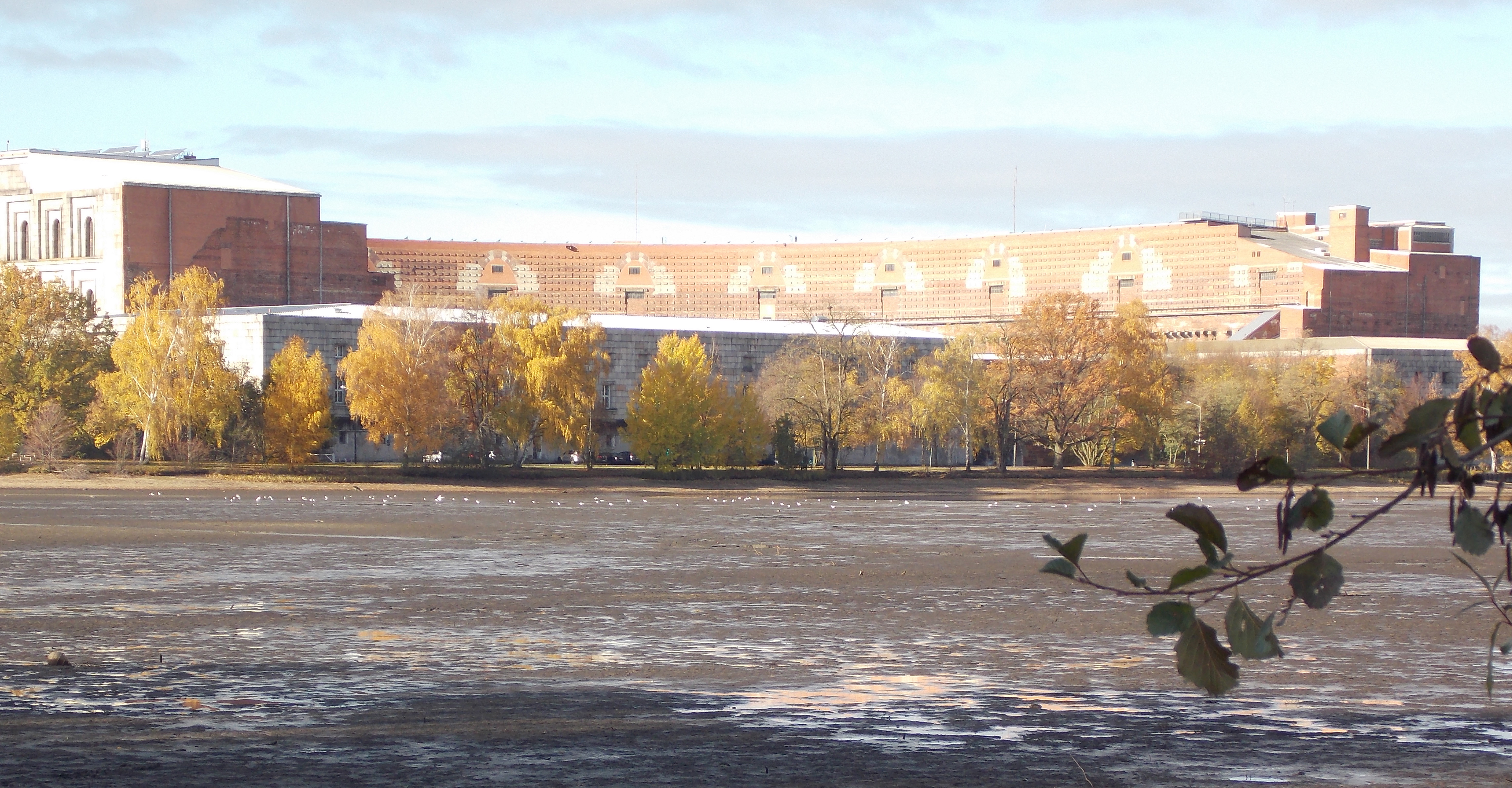We drove into and around the former Congress Hall, which was modeled after the Colosseum in Rome but would have been twice as big if it had been completed. It was built next to a lake (which was drained on this day) and the infirmity of the earth necessitated the sinking of massive pilings, but Hitler thought it would look twice as big when reflected in the water. It had huge doors that were designed to make any individual walking through them feel weak and insignificant; only when he is part of the masses should a man feel strong.