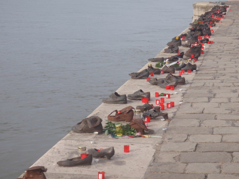 Bronze shoes affixed to the concrete and candles and flowers left by visitors pay tribute to the Jews who were brought to the bank of the Danube during WWII, and shot and dumped in the river by Hungarian Nazis.