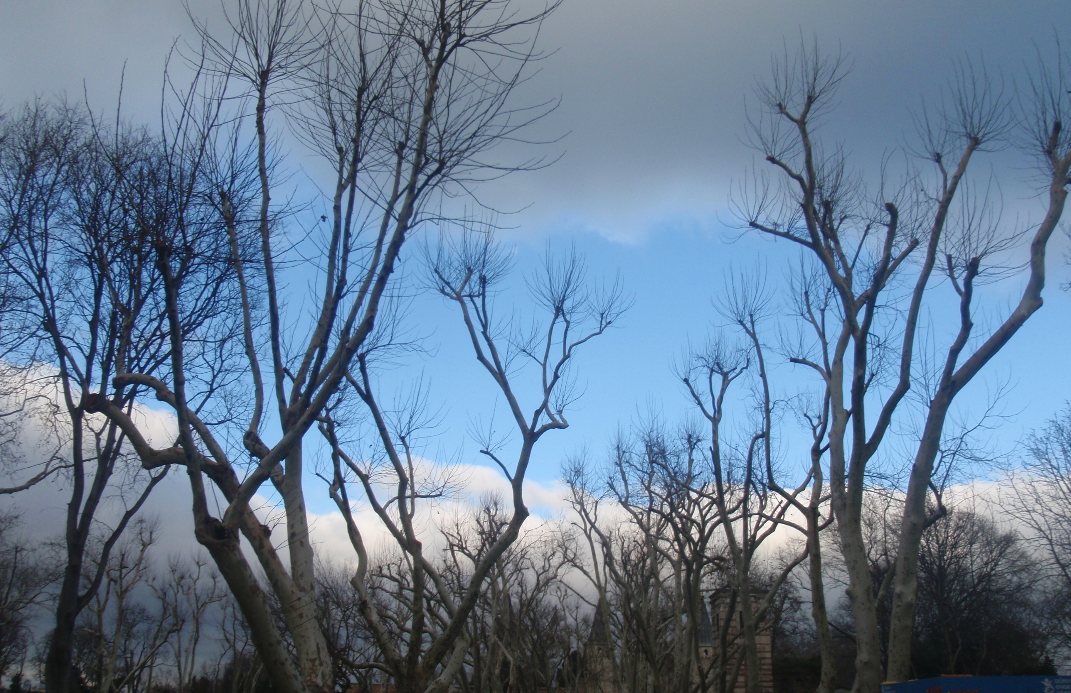 This is almost a black-and-white photograph except for a couple of hearty trees hanging onto the last vestiges of autumn.