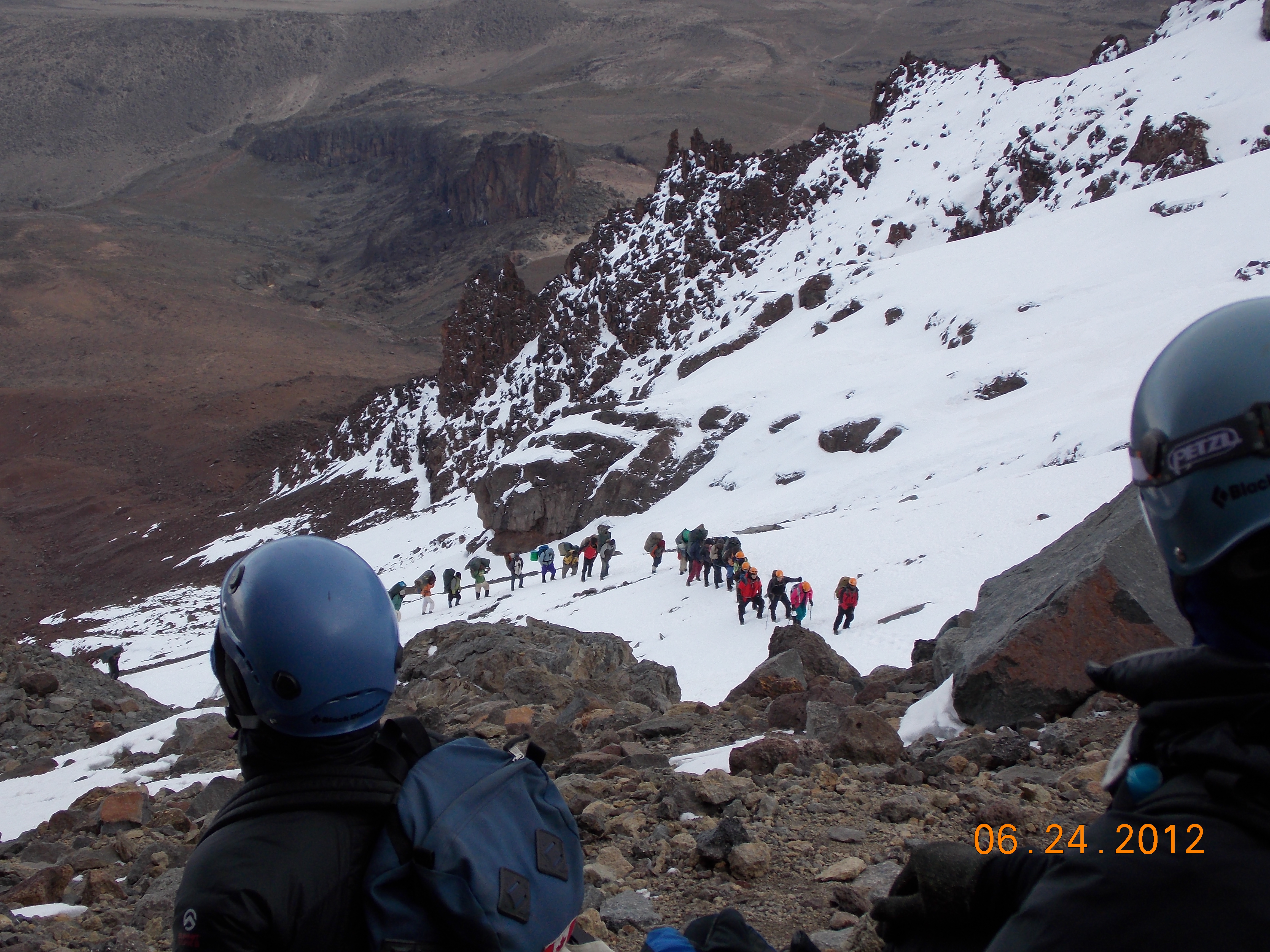 I think the hiking over the first five days, as tough as some of it was, was not overly surprising to anyone. But the sixth day was a different matter. On that day we went from our camp at 16,000 feet up the Western Breach glacier to 18,500, and I will tell you that any idiot who says Kilimanjaro is just a hike and is nothing technical hasn’t done the Western Breach the way we did it. We started at 5 am in order to get past a certain point before the sun hits that side of the mountain, softens the ice and causes rocks to loosen and fall, the reason we all had to wear helmets on this day.