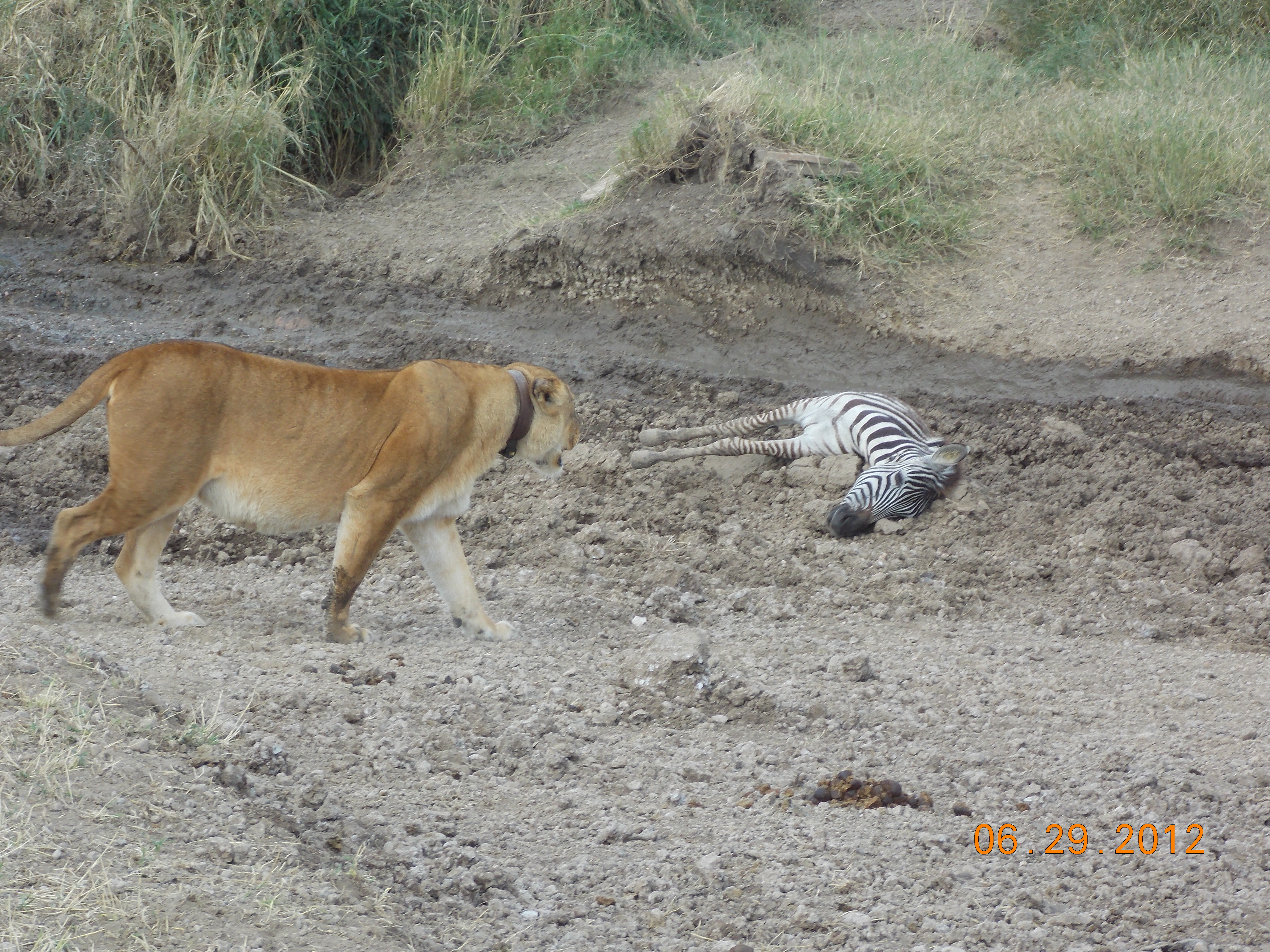 Anyway, the lion came over and sniffed the zebra, but wouldn’t touch it. The cubs climbed on it, but they all quickly moved on toward a herd of live zebra, who saw what was going on and hoofed it out of there. The guide network reported later that the zebra had been killed by a snake – either cobra or black mamba – and the scent of the venom is what turned the lions away.  Image