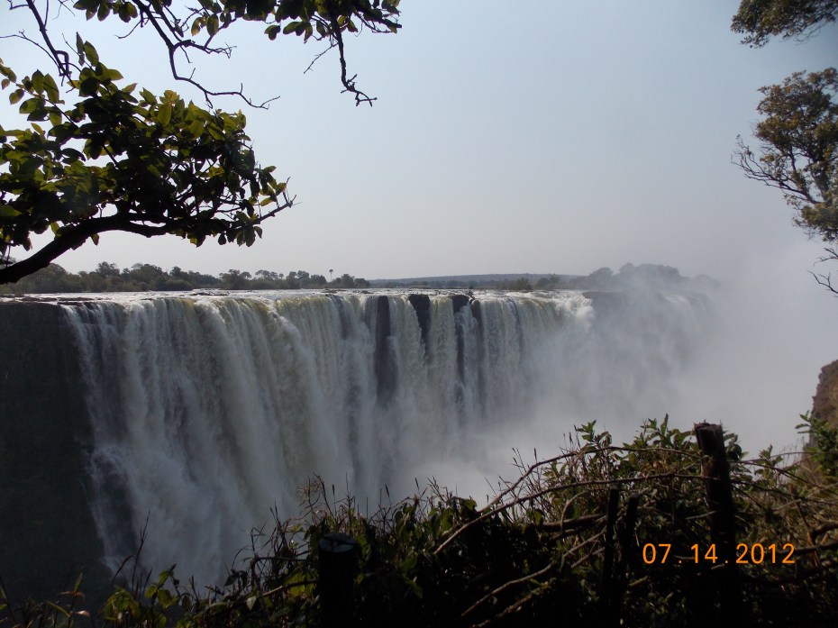 The next morning I walked the mile or so to the Falls, foolishly rented a raincoat for $5 (the currency in Zimbabwe is the American dollar!) and then walked the paths to the various overlook points. It was magnificent, although the further you go the less you can see because the mist created by the Falls is so thick. There is a statue of David Livingstone, the British explorer and missionary who was the first European to see Victoria Falls in 1856, and it’s fun to think about him hacking his way through the jungle, hearing it first, maybe seeing some mist through the trees, and finally breaking through to this amazing sight. I’m sure he was a Scottish gentleman and didn’t say what I would have said, but I’d love to hear the recording of whatever it was. The natives called it Mosi-oa-tunya … The Smoke that Thunders. Livingstone renamed it after his Queen.