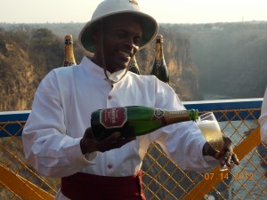 The train ride that evening was touristy, but fun. The steam engine was made in England in 1952 but some of the cars date back over 100 years, and the staff in their white uniforms and pith helmets give it a nice authentic feel. You don’t have to go far to get to the bridge over the river, which affords some beautiful shots of the Falls in one direction and a lovely gorge in the other. After actually crossing the border into Zambia you get off the train at the far end of the bridge and walk around for 45 minutes with a glass of champagne, fending off the vendors and watching the bungee jumpers, waiting for the sun to set.