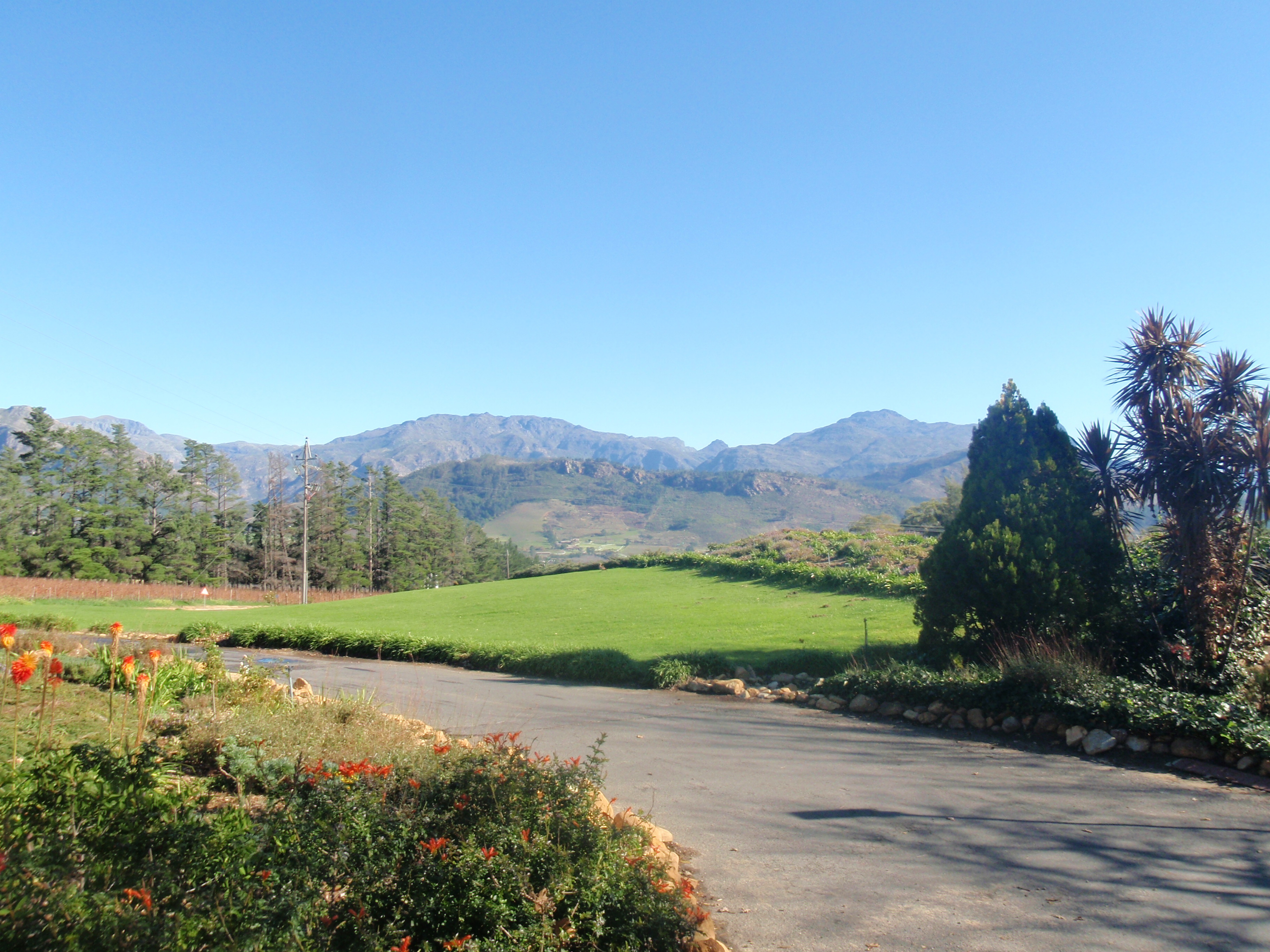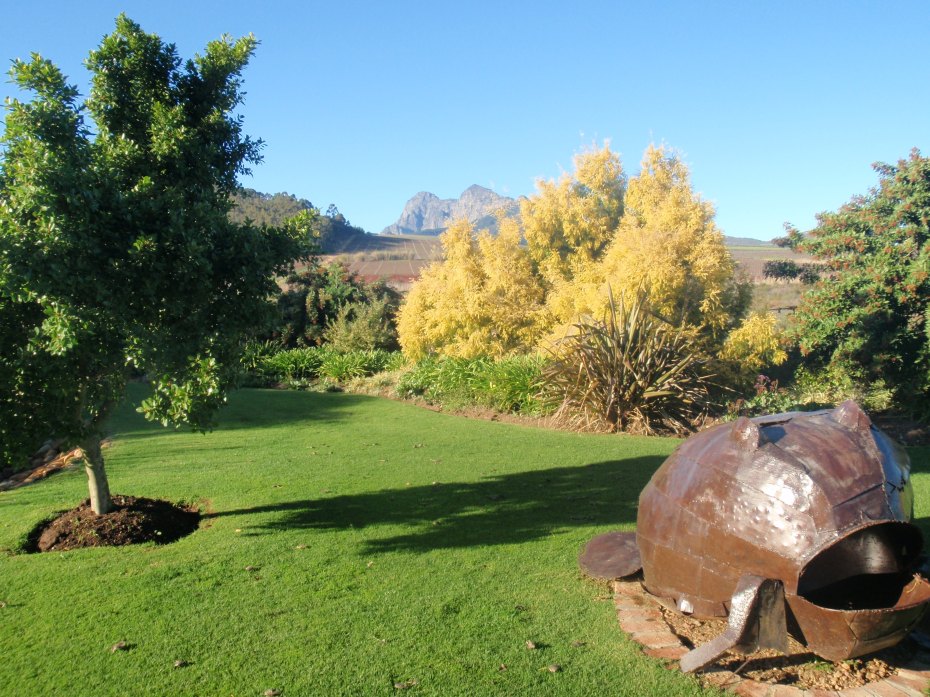 We were going back through wine country and decided to look for Ernie Els’ winery, which we found at the end of a long road that also led to other estates. The fields of dormant grapes went on as far as we could see. Unfortunately the winery was closed on Sunday, but we walked around the place and everything reeked of class, not surprising considering the wines that come out of here are considered of the highest quality. Well done, Ernie.
