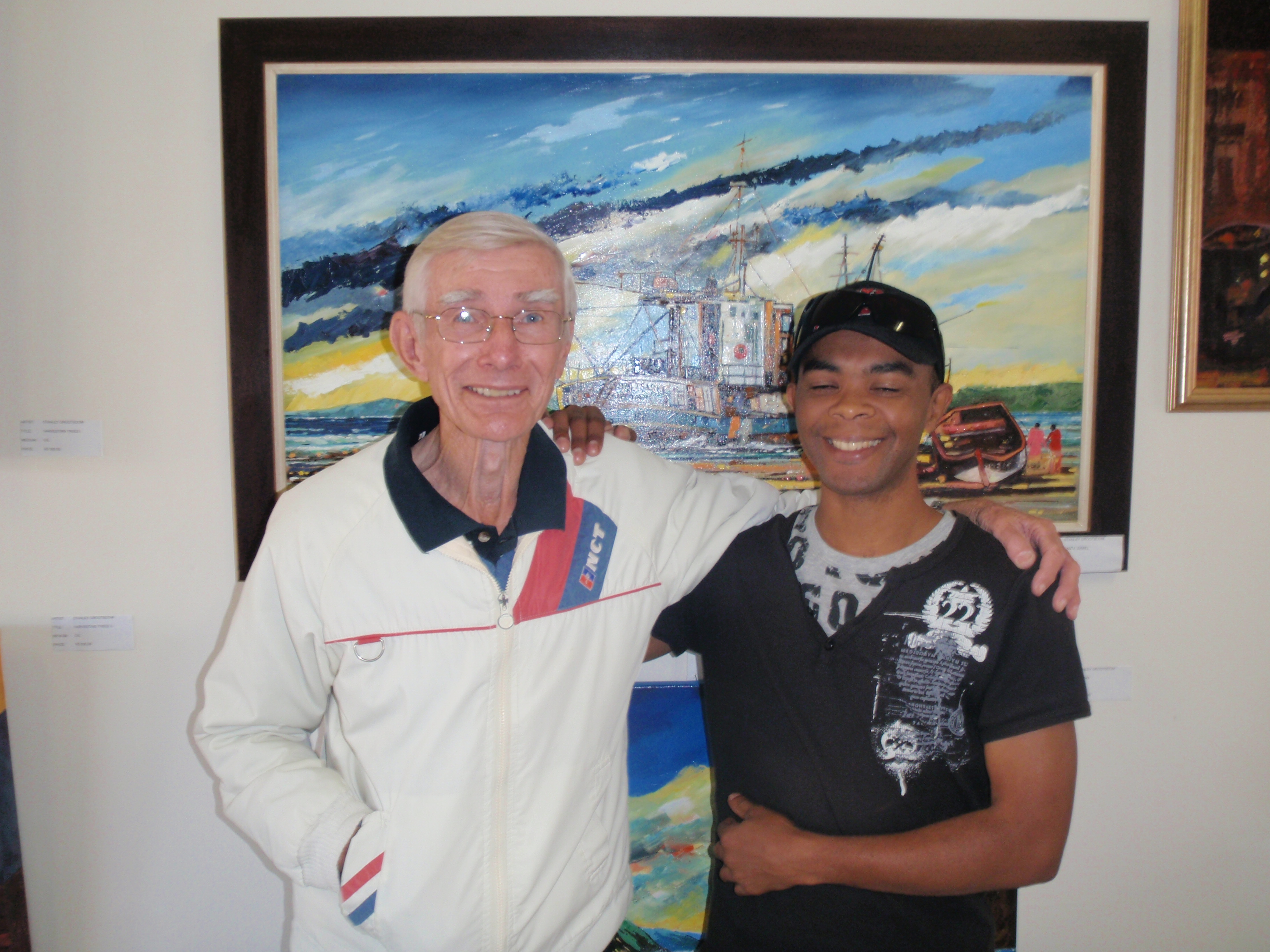 He has a fondness for beach scenes, with boats and fishermen and palm trees and colorful skies; it seems to fit with his placid and kind demeanor. That purple painting in his photograph is mine now.