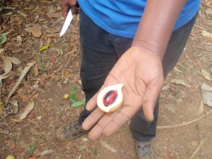 On Sunday, before catching the ferry back to Dar-es-Salaam, we visited a spice plantation and had an historical tour of Stone Town. I wasn’t especially looking forward to the former but it was actually quite interesting. A delightful man who called himself “Mr. Spice” gave us the tour, and in an area that couldn’t have been more than half an acre we saw papaya and mango trees, lemon grass, aloe plants, jack fruit, white and dark cocoa, cardamom, nutmeg (pictured), clove, taro root, turmeric, star fruit, coconut (the yellow for drinking, the brown for eating), cassava, allspice, cinnamon, bread fruit, pineapple, anato dye, mbilimbi (substituted here for lemons and limes), peppercorn, a coffee tree, ginger, henna, a vanilla vine and probably a few I missed. They served us a great lunch and sold us spices. I bought a bar of clove soap and have smelled like a Christmas ham ever since.