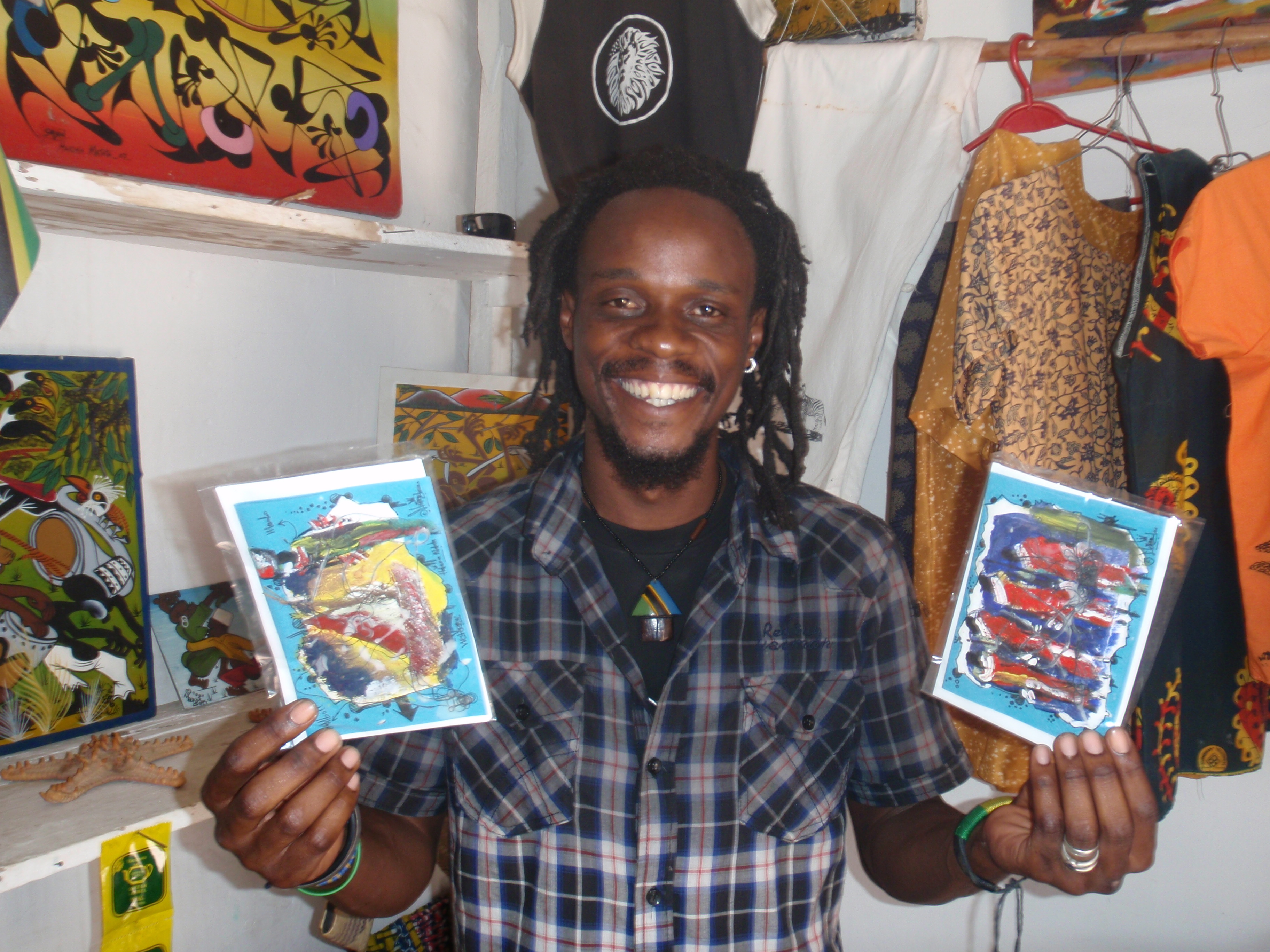 They do it all: paintings, clothing and wonderful hand-made note cards. Sadick came up with a unique “I love Bagamoyo” logo and now you see his t-shirts all over town. He’s working on one for Tanzania, which should expand his reach.